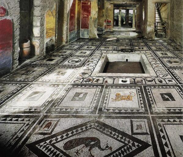 Floors can be simple, like the brick herringbone in Johnson’s house, or complex, like the mosaic floors in the Roman villas in Pompeii. But either way, the floors can define a place. In Johnson’s house, you can see how the brick floor defines the space of the house. Likewise, the carpet defines the place of the conversation area within the house.