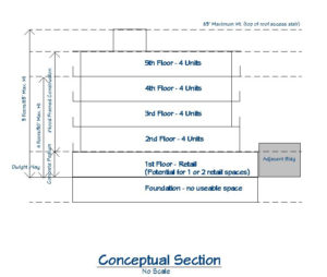 The Solution: I prepared a feasibility study. The report contained a discussion of the zoning regulations and the approval process. It also discussed both the typical construction costs for this type of building as well as the likely sales prices and rental income possible in the current economic situation. The report also provide a conceptual design to demonstrate it was possible to meet the code requirements.